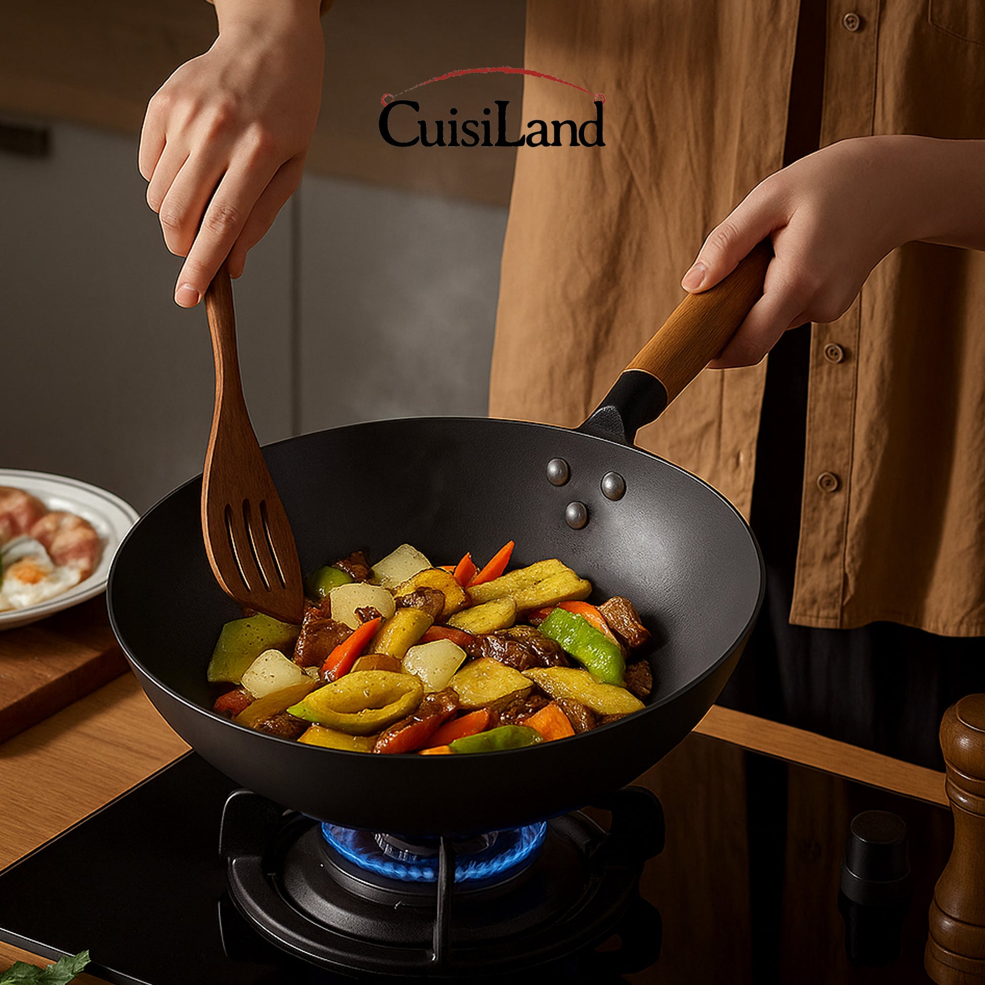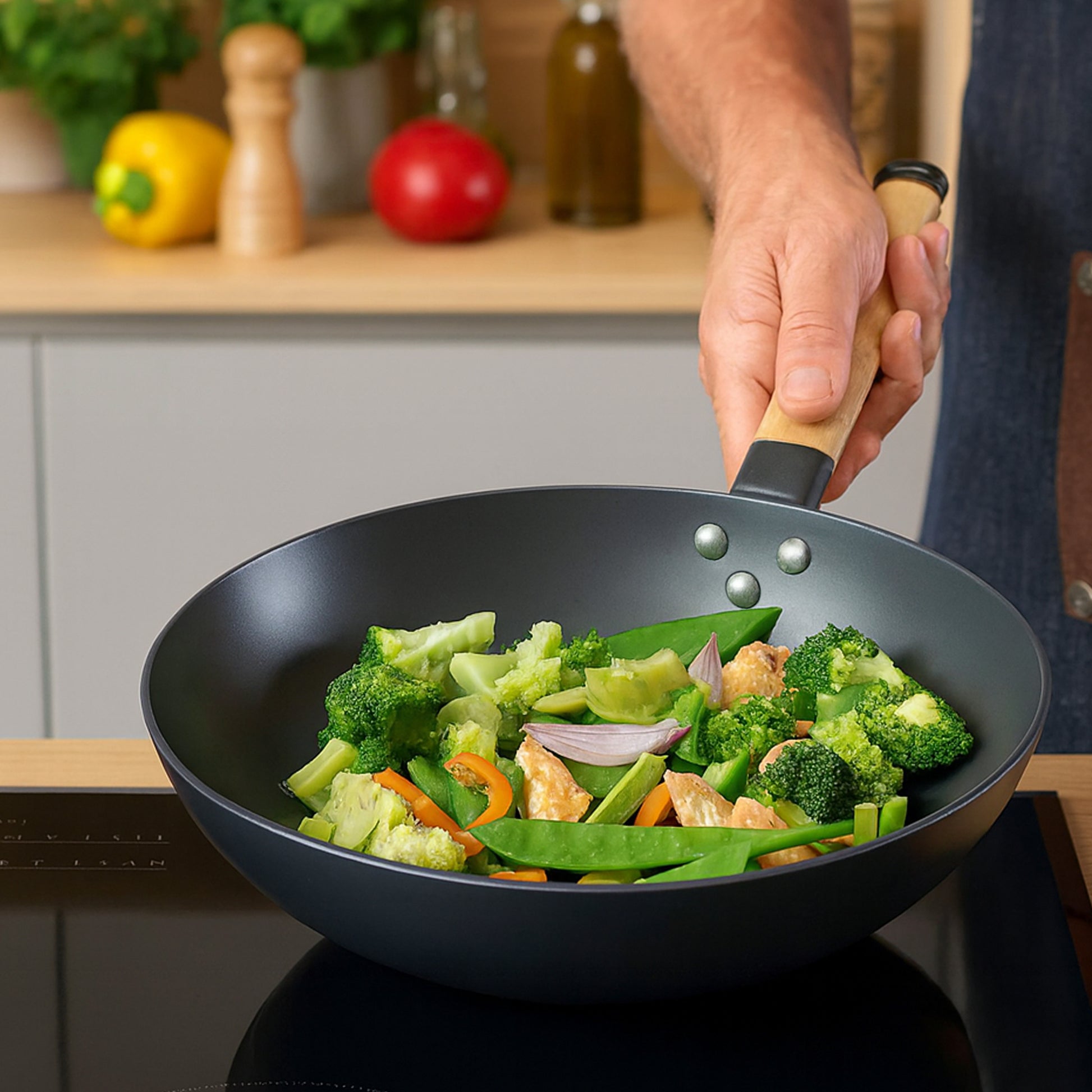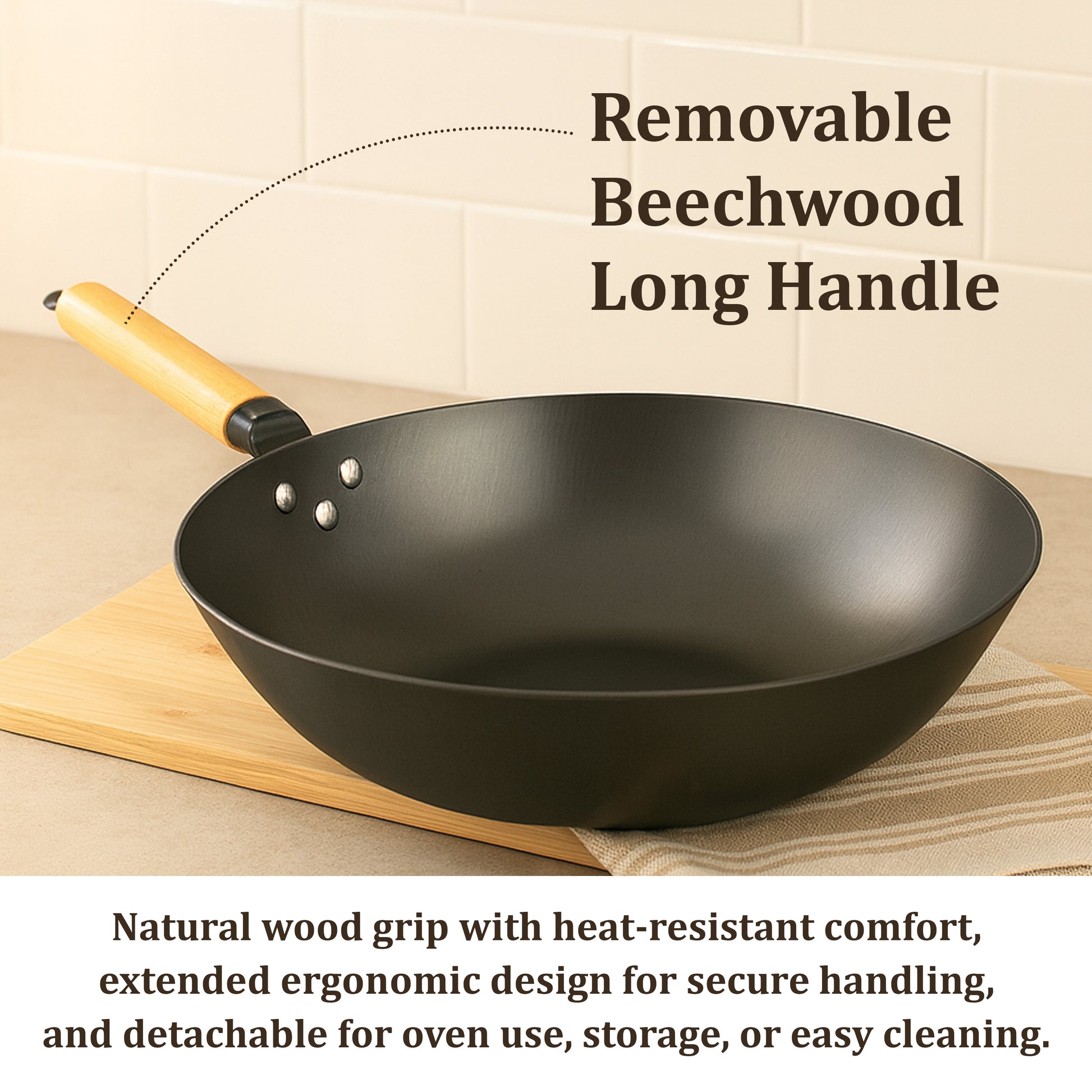- ERGONOMIC NATURAL BEECHWOOD HANDLE – Crafted from solid beechwood, the handle stays cool longer on the stovetop, offers a comfortable non-slip grip, and is double-riveted for lasting stability with a stylish, natural finish.