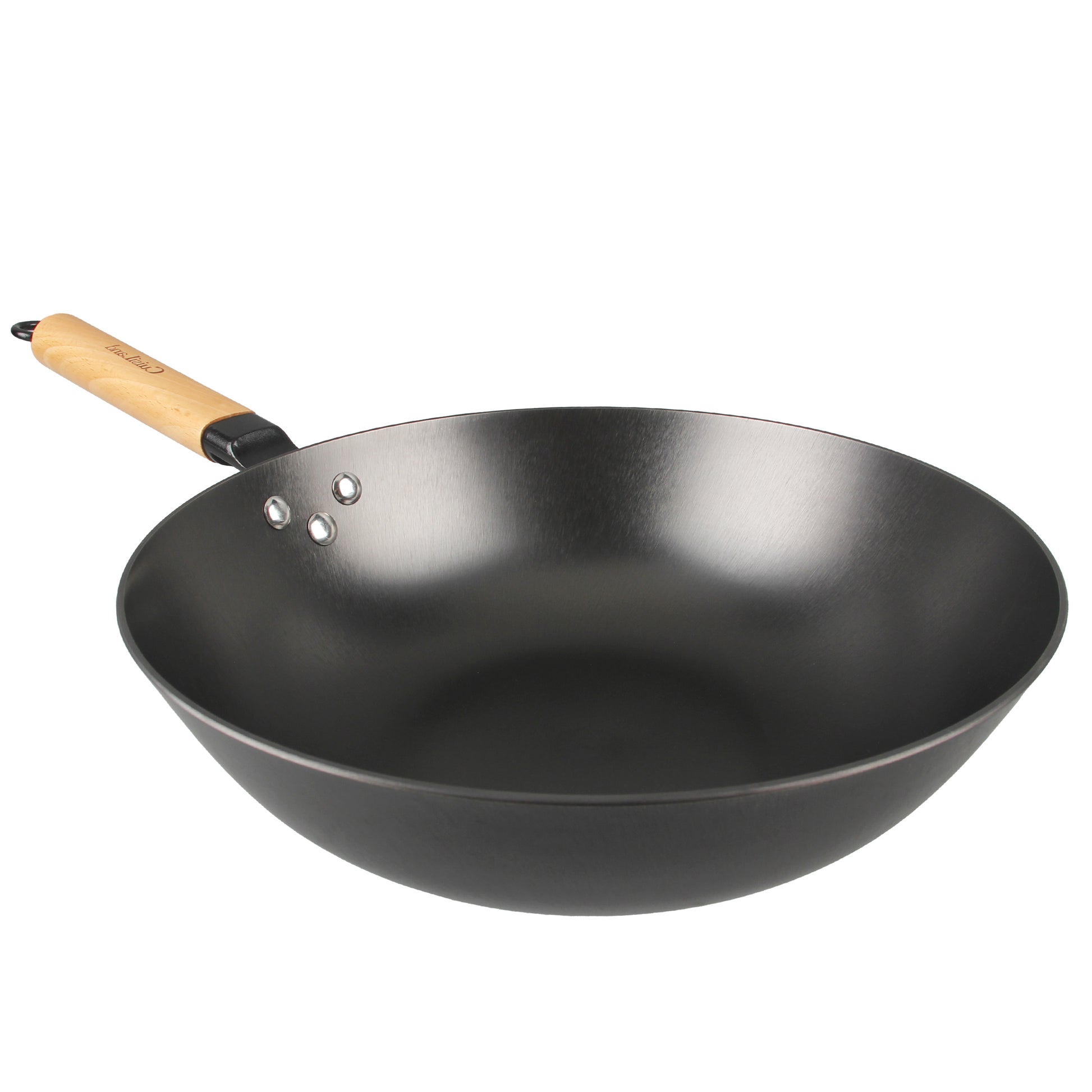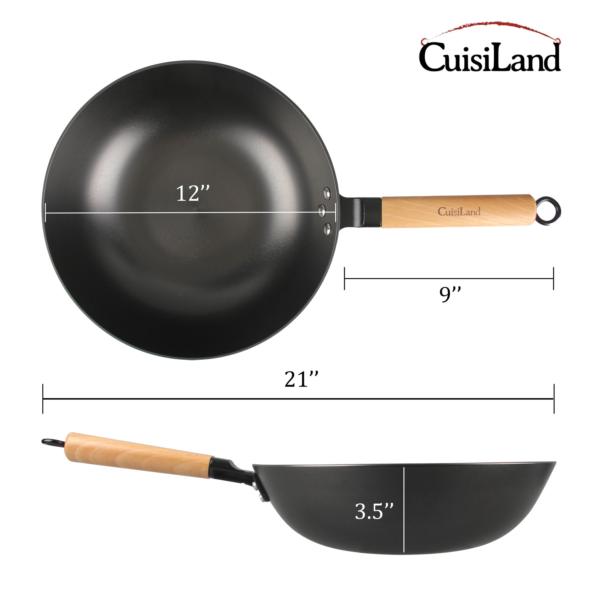 - 12” Diameter | 3.5” Depth | 9” Handle Length | 21” Overall Length - Spacious nitrided cast iron wok perfect for stir-frying, sautéing, searing, and braising meals for the whole family.