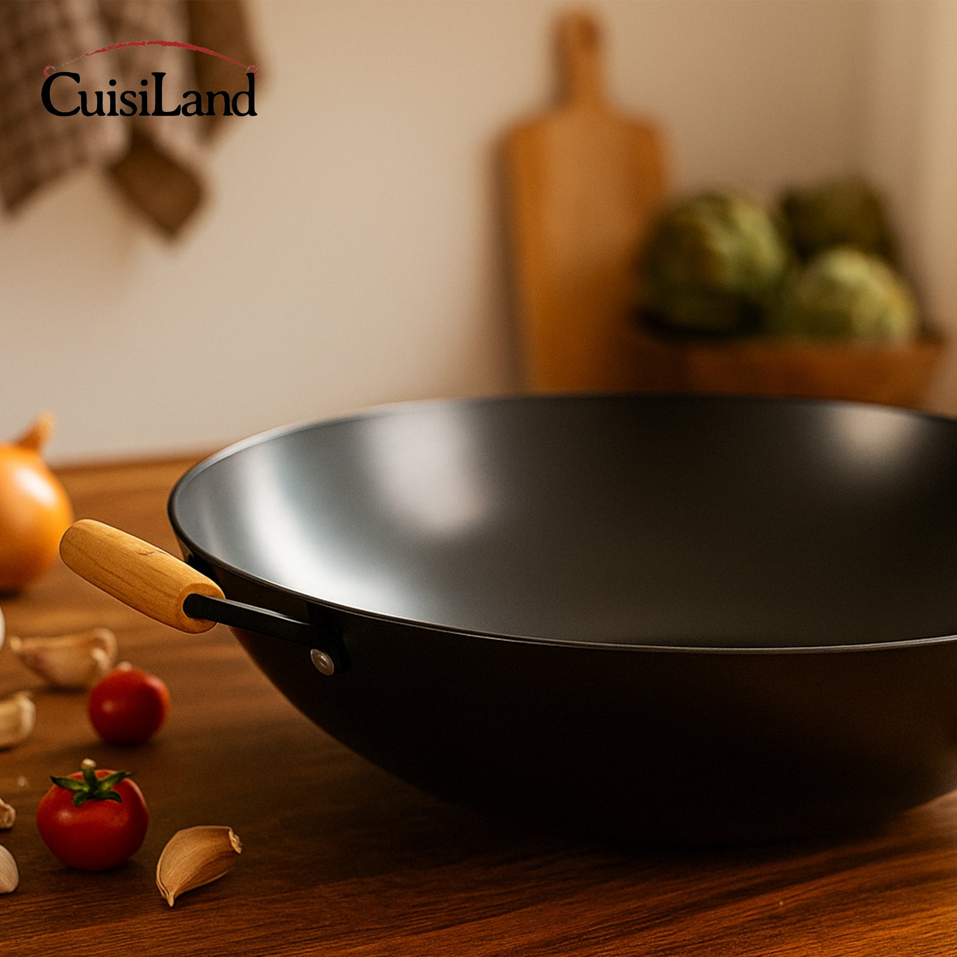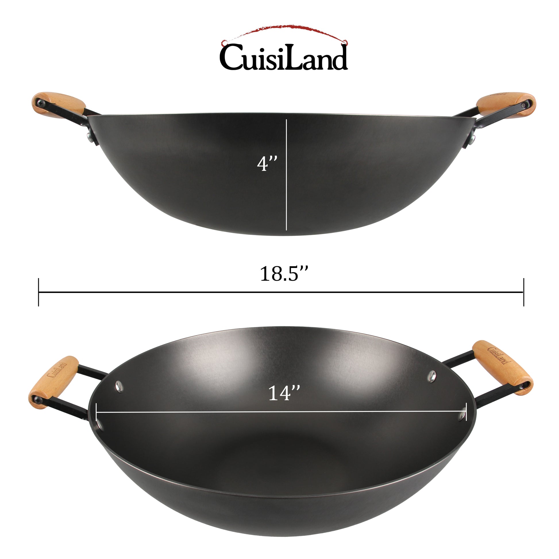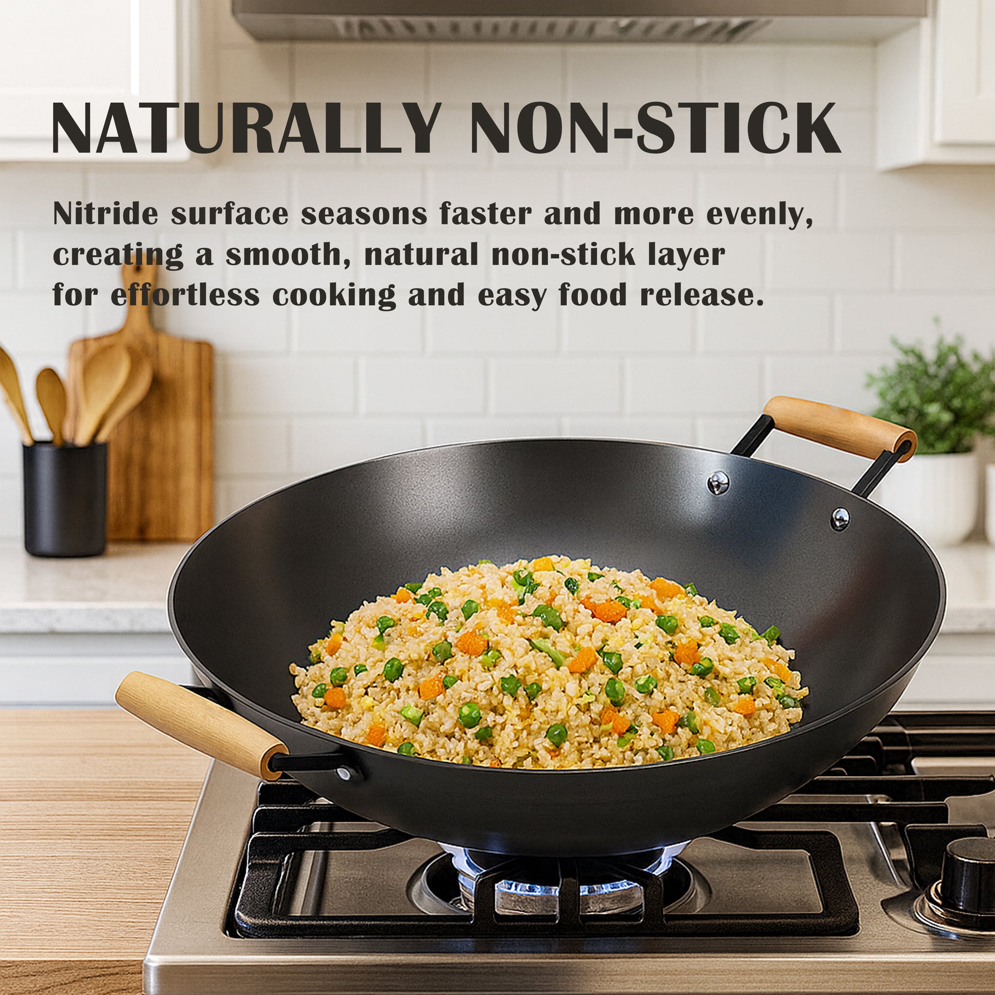 - 14” Diameter | 4” Depth | 18.5” Handle-to-Handle Width - Spacious nitrided cast iron wok ideal for cooking generous portions, perfect for family dinners, gatherings, and entertaining.