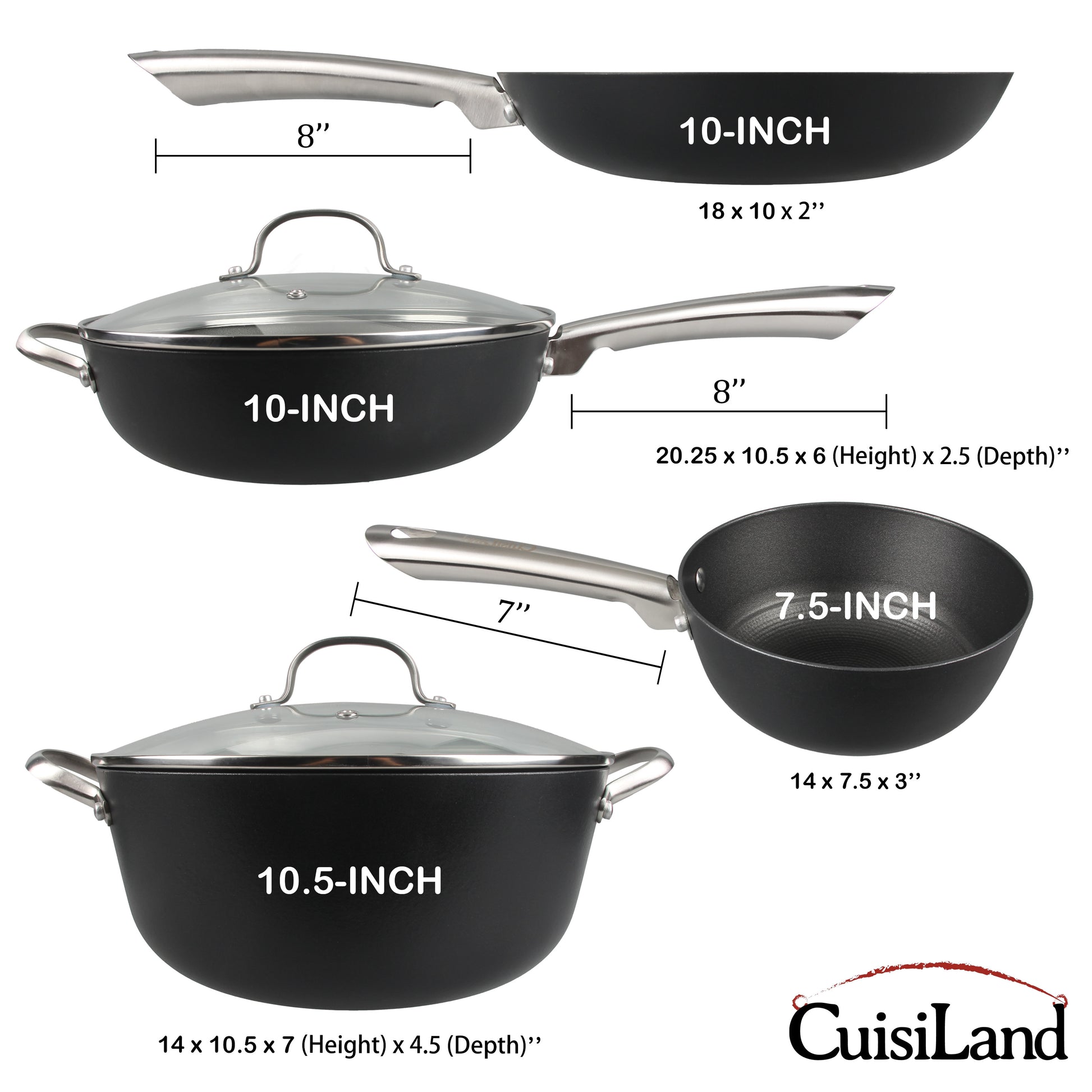- 10" Frying Pan: 18" L × 10" Dia × 2" H, Handle Length 8"