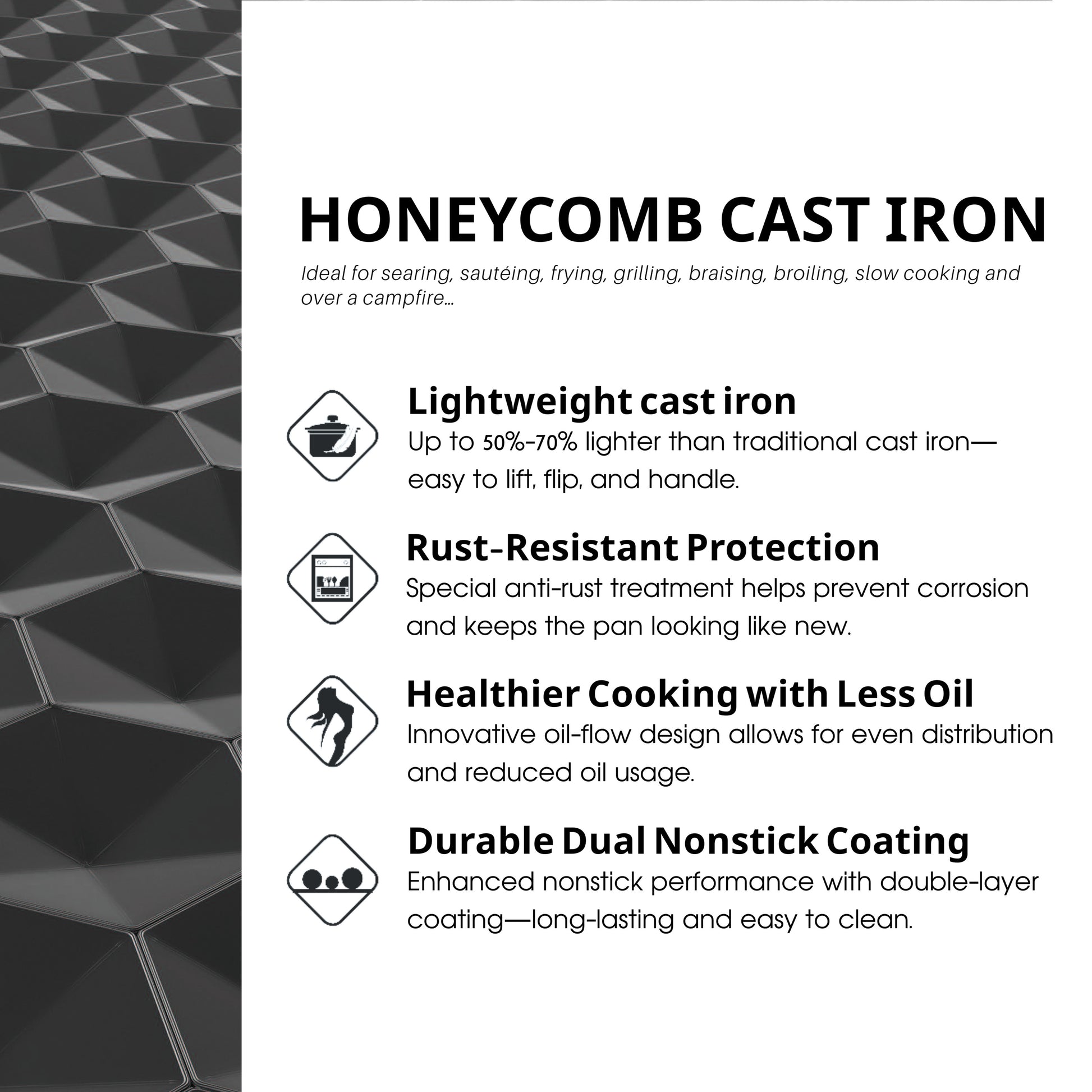 - HONEYCOMB CERAMIC COATING FOR LOW-OIL COOKING – Precision honeycomb texture evenly disperses oil droplets across the surface, reducing the need for excess oil and ensuring easy food release. Great for a variety of cooking styles without sticking.