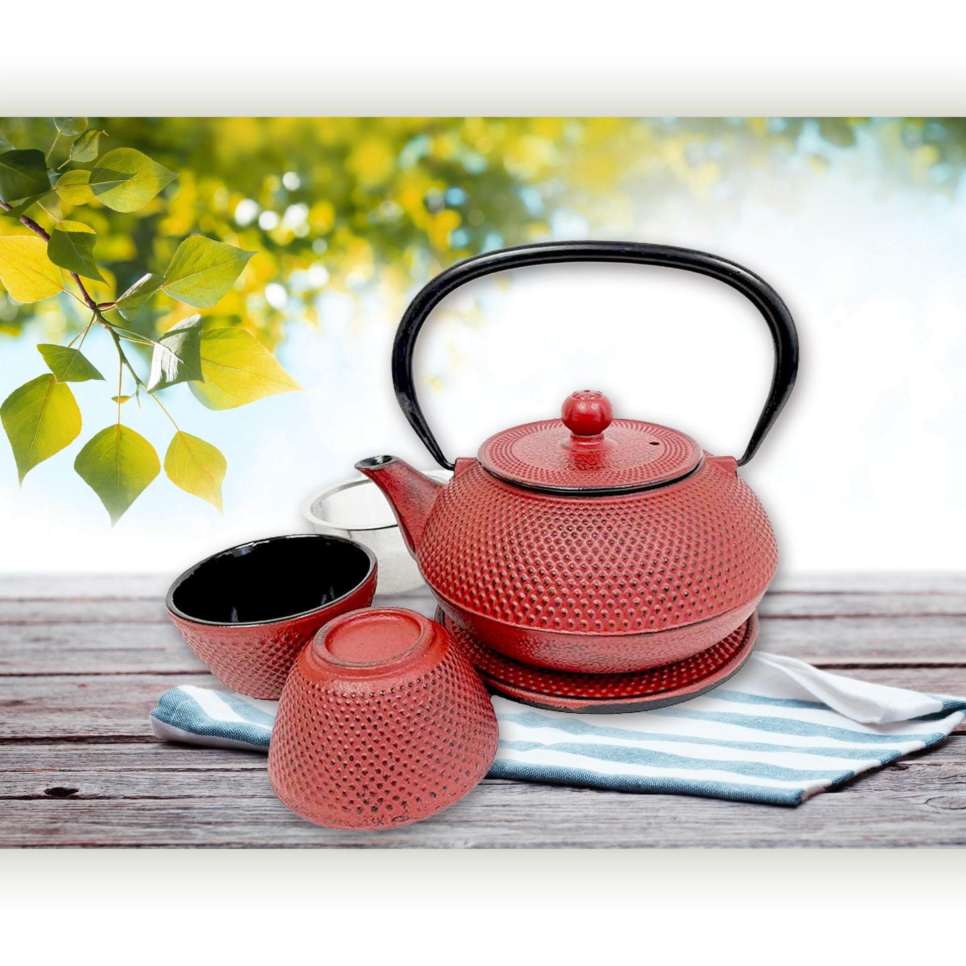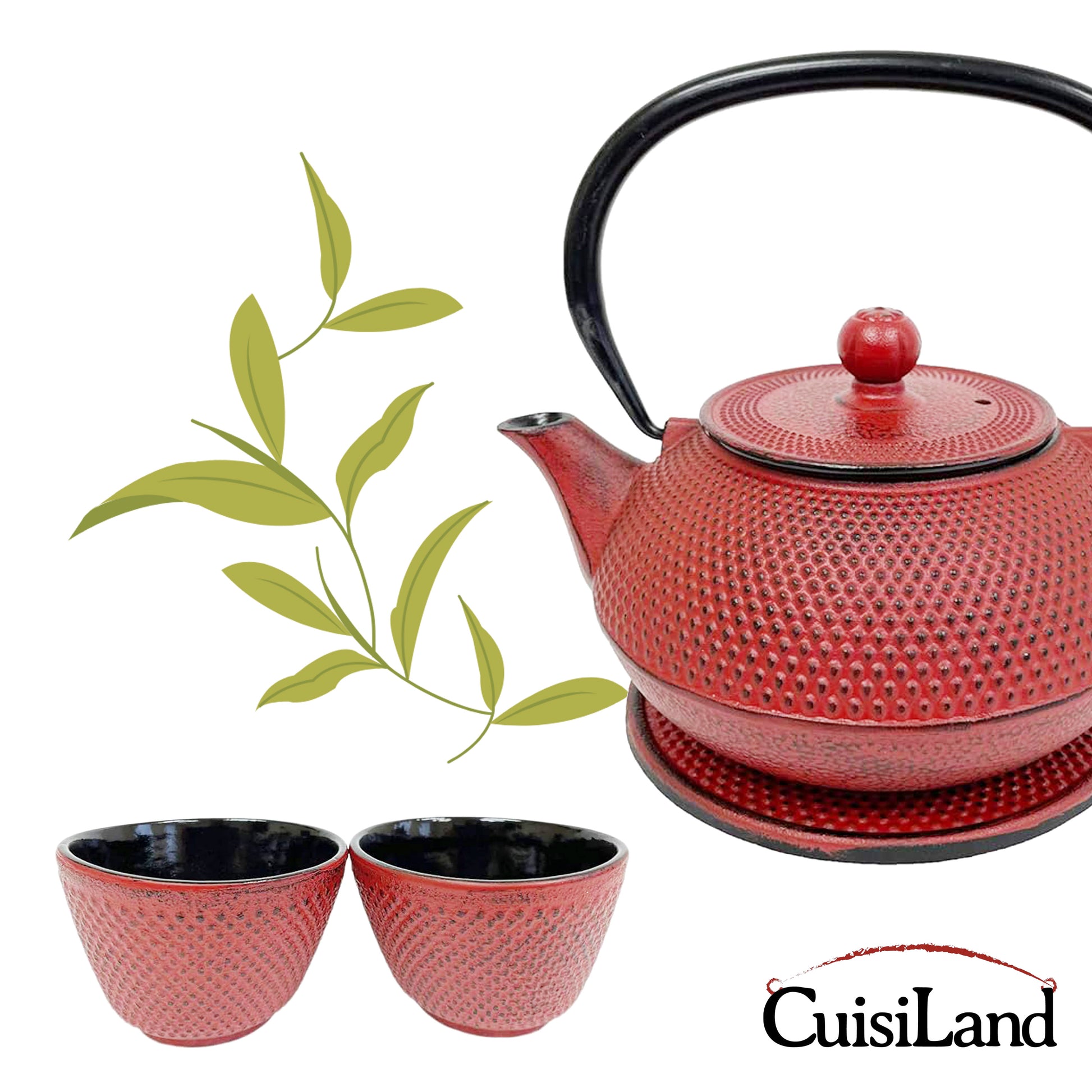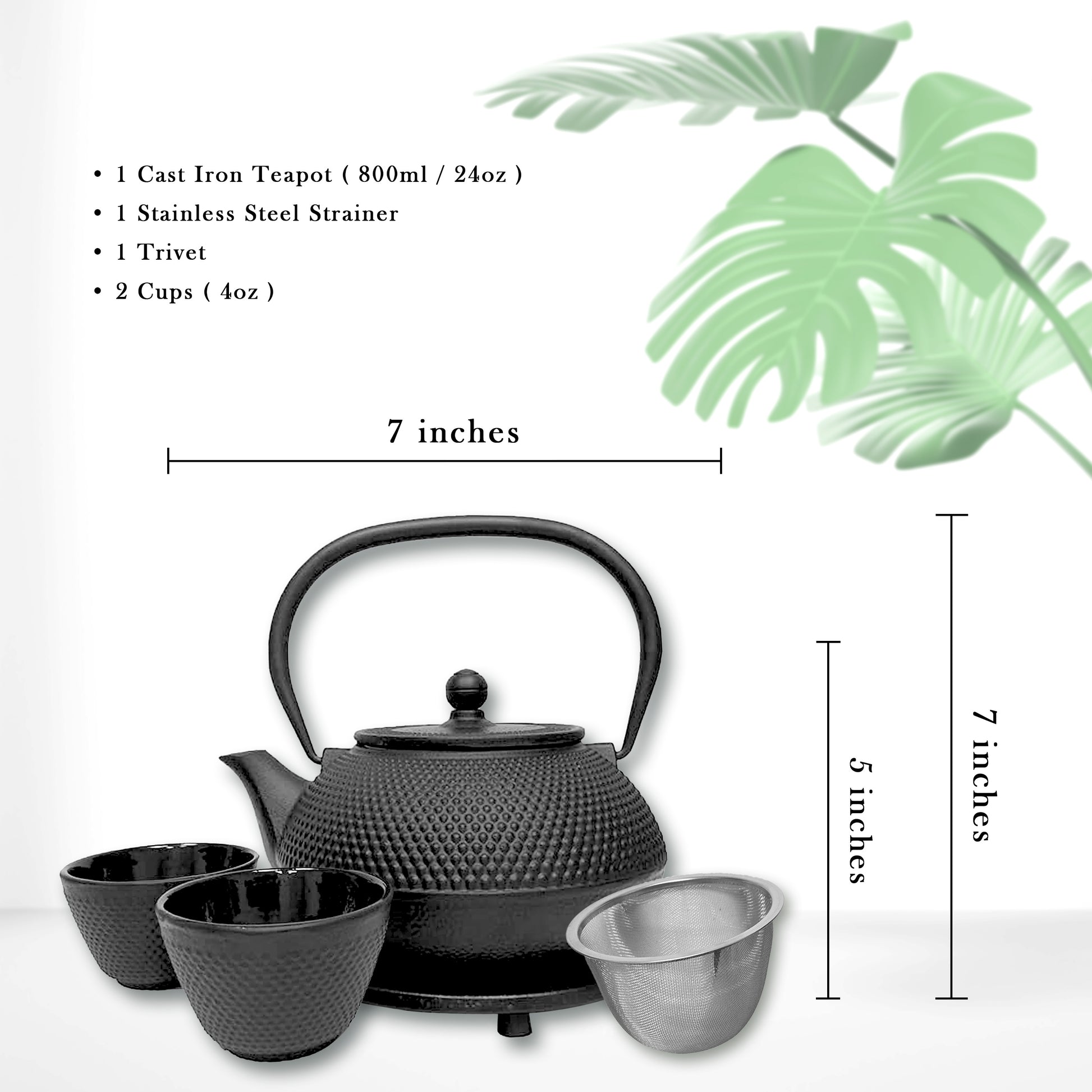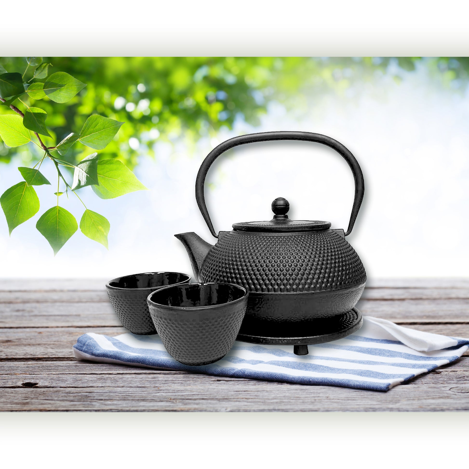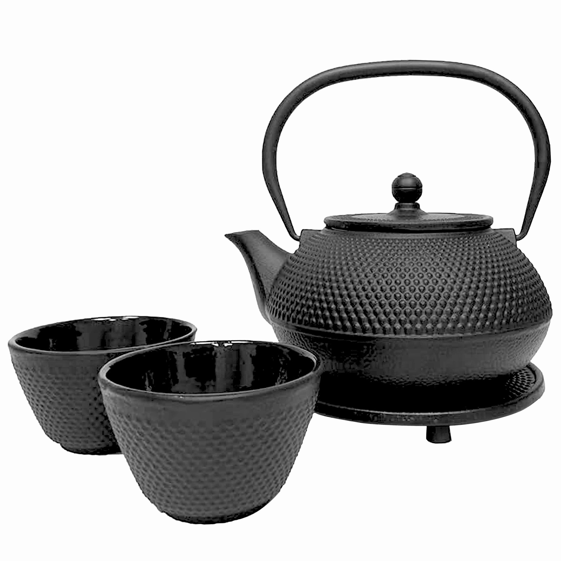 - CLASSIC BLACK NAIL-HEAD CAST IRON TEAPOT SET: This set includes a cast iron teapot, two cast iron cups, and a matching cast iron trivet, all beautifully packaged in a gift box.