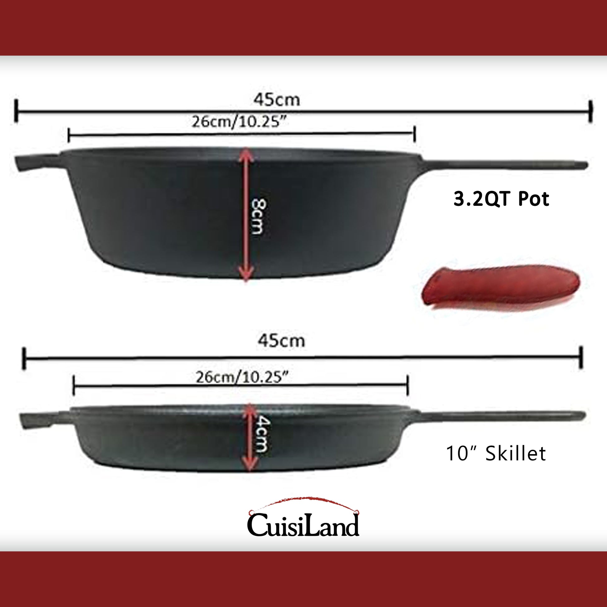 - This 2-In-1 combo cooker comes a 3.2 quarts pot, a 10.25 inch skillet and a silicone handle glove, it is ready to use and extremely versatile for almost any food recipe.